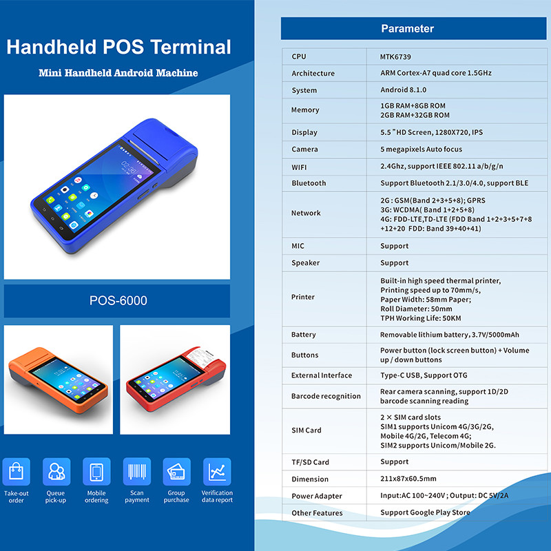 5.5" हैंडहेल्ड एंड्रॉयड पीओएस सिस्टम कैश रजिस्टर मशीन टच स्क्रीन मोबाइल पीओएस टर्मिनल वाईफाई यूएसबी एनएफसी भुगतान के लिए खुदरा नीला 17