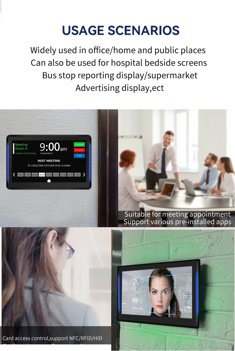 यह टैबलेट न केवल कॉन्फ्रेंस रूम बुकिंग के लिए आदर्श है, बल्कि कॉर्पोरेट इमारतों, होटलों, अस्पतालों और शैक्षिक संस्थानों में डिजिटल साइनेज प्लेयर, स्मार्ट एक्सेस कंट्रोल टर्मिनल या इंटरैक्टिव कियोस्क के रूप में भी उत्कृष्ट प्रदर्शन करता है। इंटीग्रेटर्स और डिस्ट्रीब्यूटर्स के लिए, यह एक बहुमुखी समाधान प्रदान करता है जो एक ही हार्डवेयर प्लेटफॉर्म के साथ कई प्रोजेक्ट मांगों को पूरा करता है।